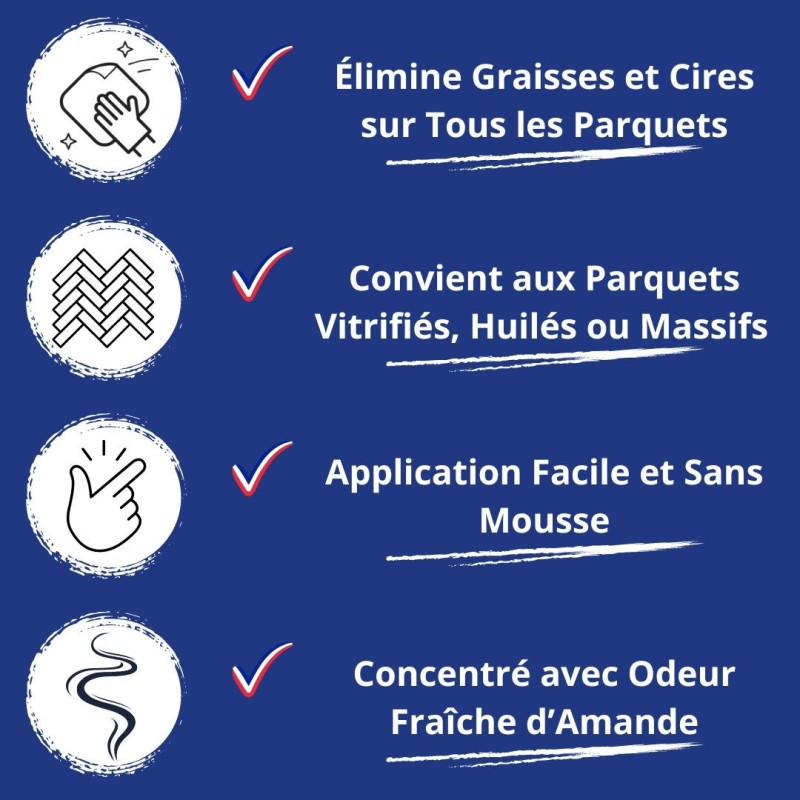 Facile à doser, mousse peu, nettoyage rapide. Parquet sec en quelques minutes.