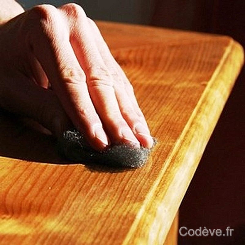 Frotter les égratignures plus profondes avec un tampon de laine d’acier n° 000 bien imprégné.