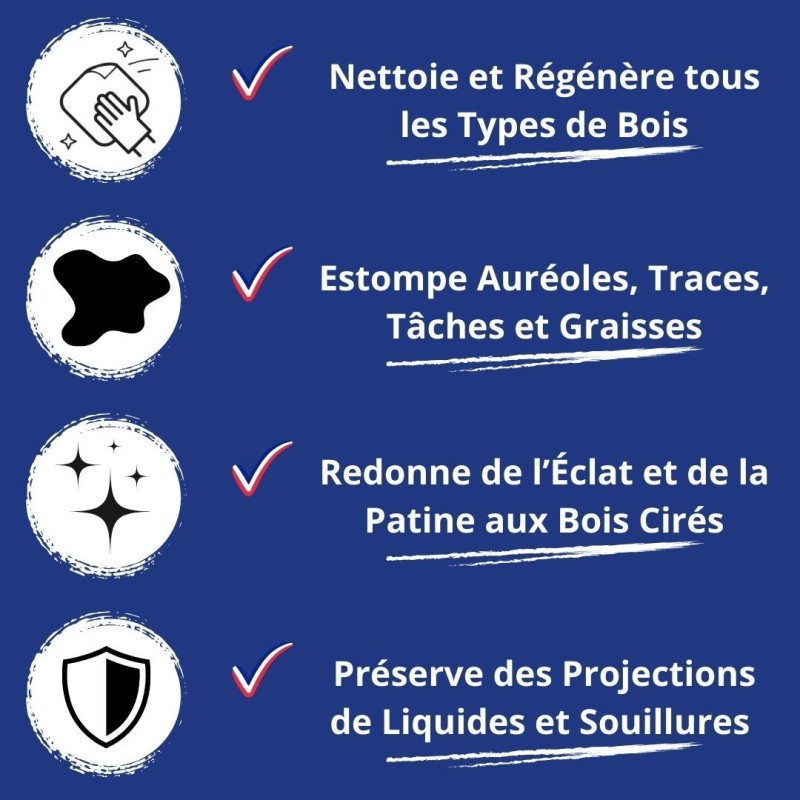 Détachant rapide pour enlever toute trace, tâche, marque, cerne ou auréole sur le bois.