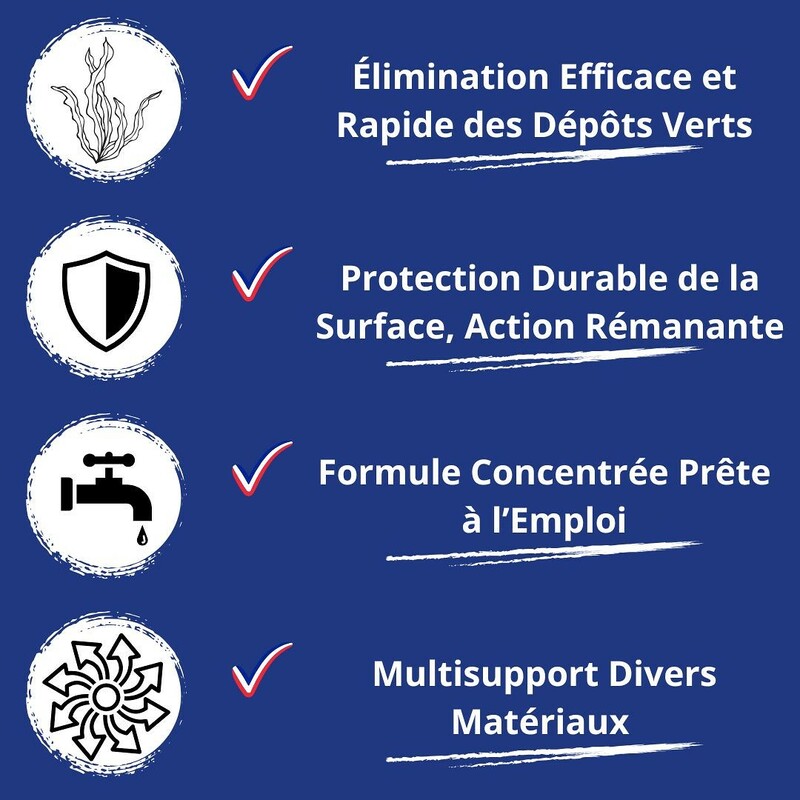Nettoie en profondeur sans altérer la surface. Supprime efficacement les dépôts verts et traces noires.