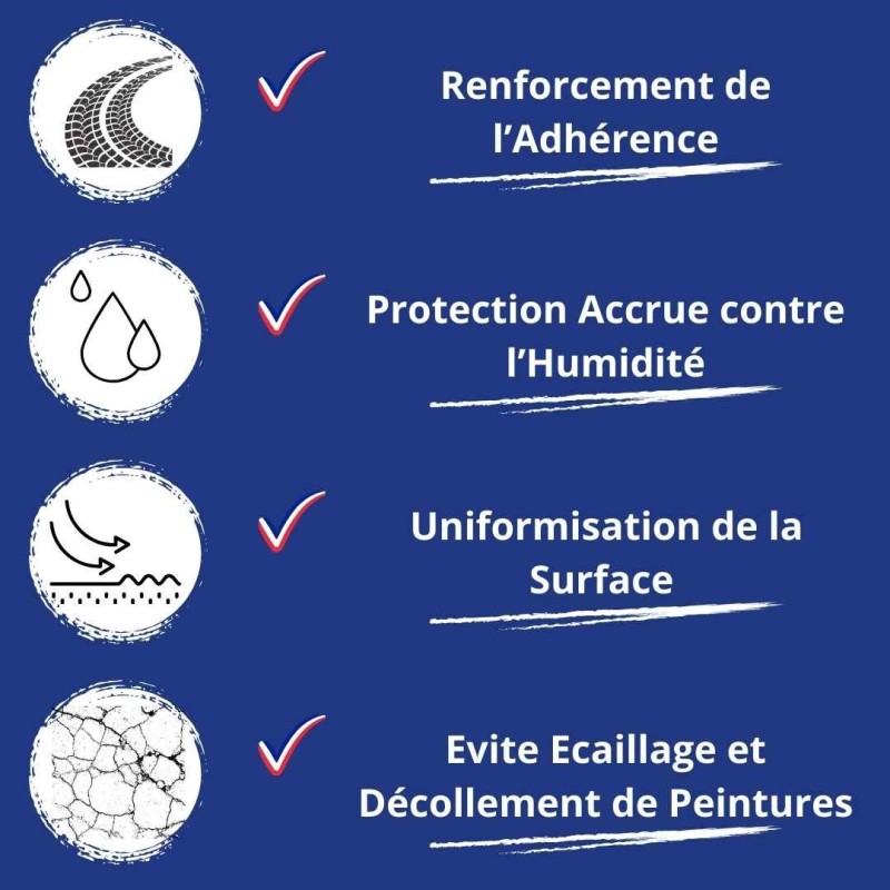 Cet apprêt à base d'eau facilite l’accrochage de la peinture de finition à venir en diminuant le risque de détrempe lors de l'application. Par la suite, ce primaire peut facilement être recouvrable par des peintures à base de résines alkydes, glycérophtalique, acrylique ou vinylique par exemple. En fait, l'application de ces produits reste souvent nécessaire avant d'utiliser la peinture de finition décorative finale. En effet, l'objectif de ces produits est bien de renforcer la tenue de l'ensemble du système de peinture pour une meilleure résistance dans la durée.