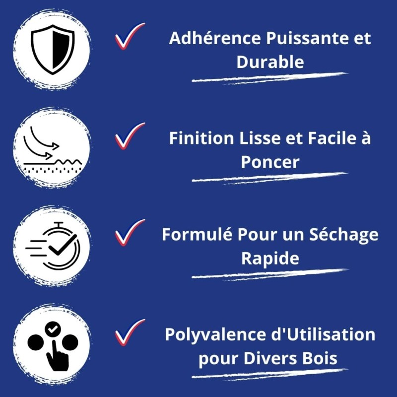 Attendre un séchage de 30 à 60 mn avant de poncer la pâte dans le sens des fibres du bois.
