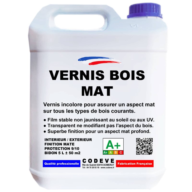 Le vernis mat pour bois permet un entretien, une protection et une superbe finition incolore pour un très bel aspect mat profond. Ce produit reste parfaitement transparent sans jamais modifier l'aspect des fibres du bois. D'ailleurs, ce vernis est recommandé pour toutes les essences de bois européennes, exotiques ou tropicales. Ce produit convient donc particulièrement bien sur les menuiseries, boiseries, meubles, huisseries, portes, fenêtres ou volets par exemple.