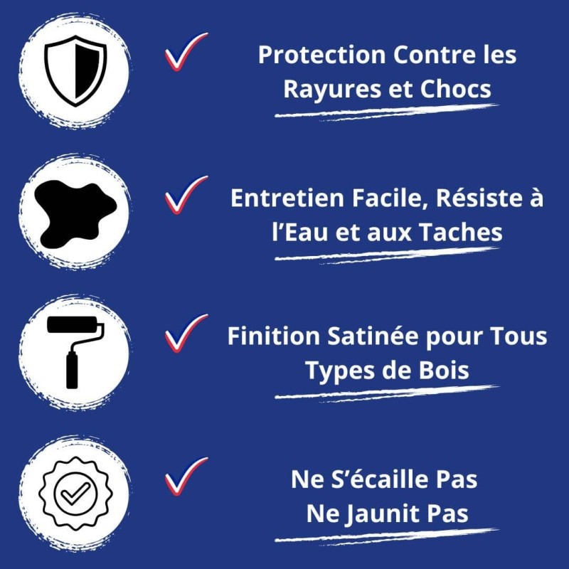 Ce vernis pour le bois reste une très bonne solution pour apporter une protection efficace du bois contre les taches indésirables. En effet, ce produit préserve le bois des liquides alimentaires quotidiens tels les graisses, les huiles, les fruits, les alcools, les vins, les cafés ou autres produits chimiques corrosifs. Ce vernis offre également une excellente protection des surfaces contre les salissures, les auréoles, les marques ou les coulures.