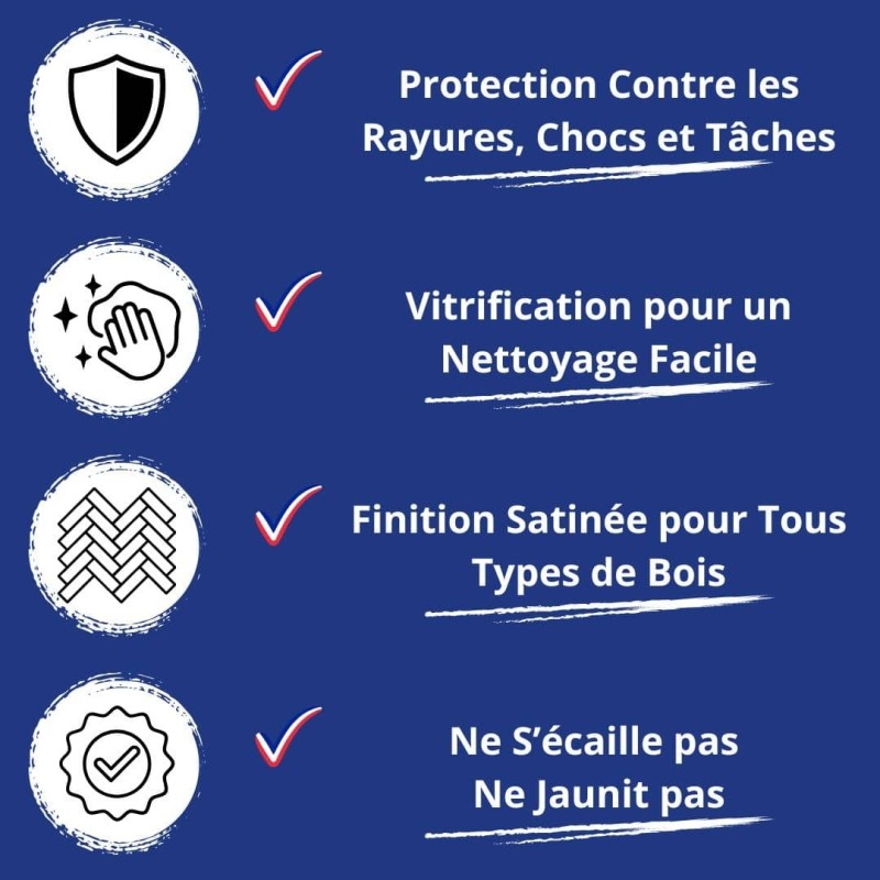 Un fond dur fin stabilise les fibres, puis vitrification satinée. Le bois vitrifié gagne en netteté, les salissures se retirent en un coup d’éponge.